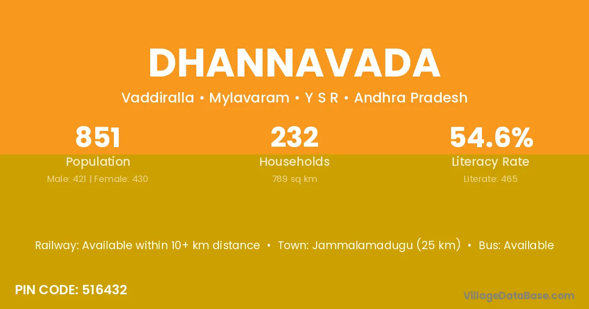 Jammalamadugu (25 km) is the nearest town to Dhannavada village for major economic activities and is located approximately 25 km away.