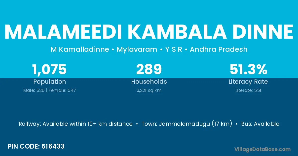 Jammalamadugu (17 km) is the nearest town to Malameedi Kambala Dinne village for major economic activities and is located approximately 17 km away.