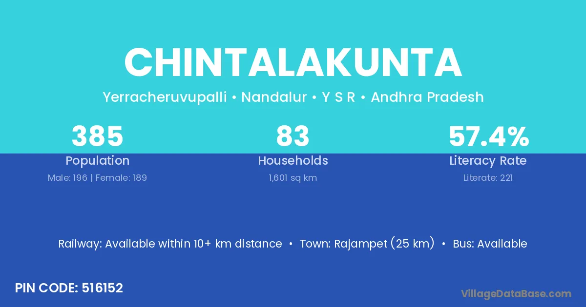 Rajampet (25 km) is the nearest town to Chintalakunta village for major economic activities and is located approximately 25 km away.