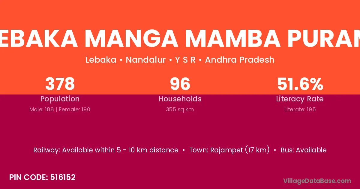 Lebaka Manga Mamba Puram village has a total population of 378 people, of which 188 are males and 190 are females.