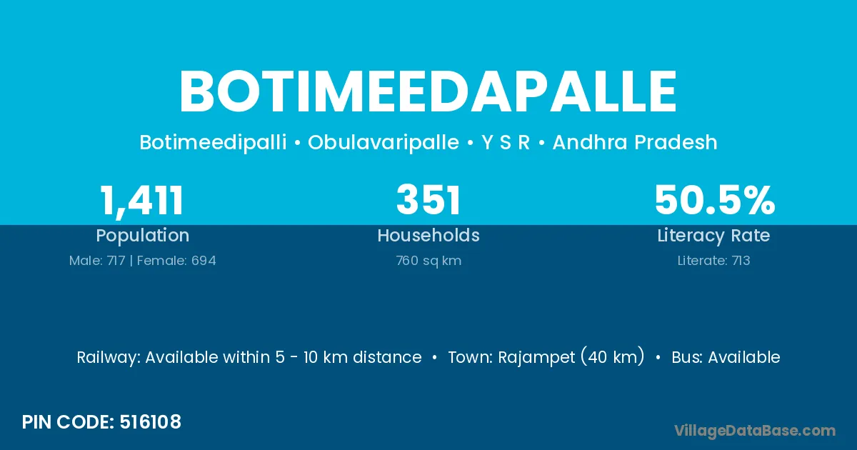 Rajampet (40 km) is the nearest town to Botimeedapalle village for major economic activities and is located approximately 40 km away.