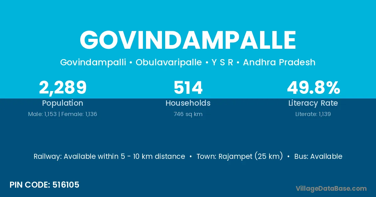 Rajampet (25 km) is the nearest town to Govindampalle village for major economic activities and is located approximately 25 km away.