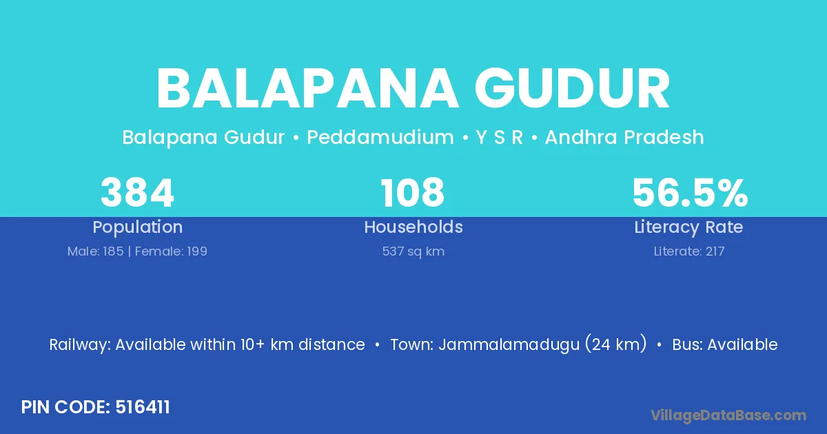 Jammalamadugu (24 km) is the nearest town to Balapana Gudur village for major economic activities and is located approximately 24 km away.