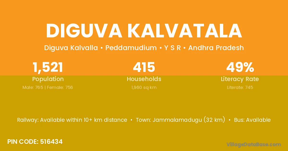 Jammalamadugu (32 km) is the nearest town to Diguva Kalvatala village for major economic activities and is located approximately 32 km away.