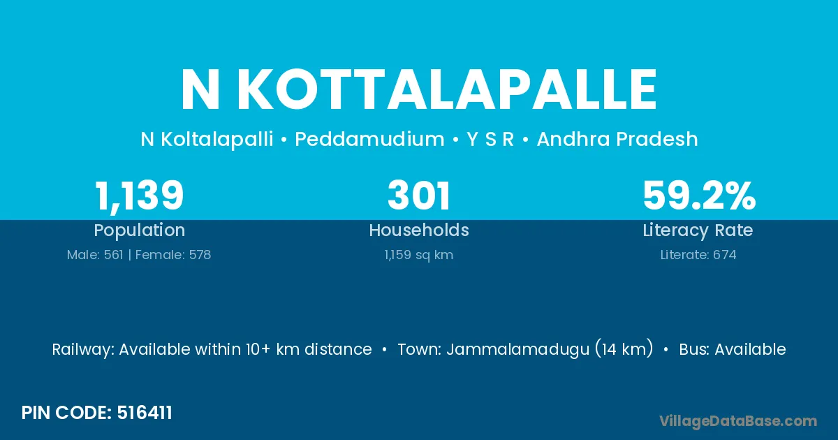 Jammalamadugu (14 km) is the nearest town to N Kottalapalle village for major economic activities and is located approximately 14 km away.