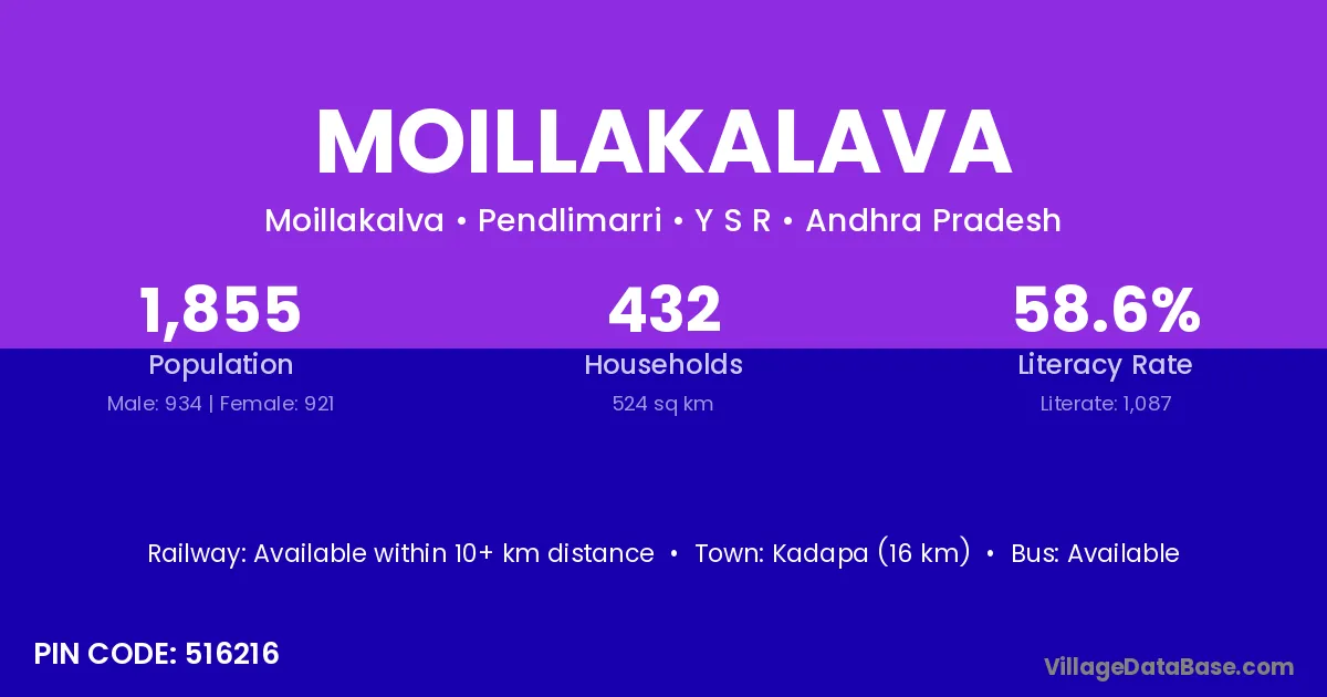 Kadapa (16 km) is the nearest town to Moillakalava village for major economic activities and is located approximately 16 km away.