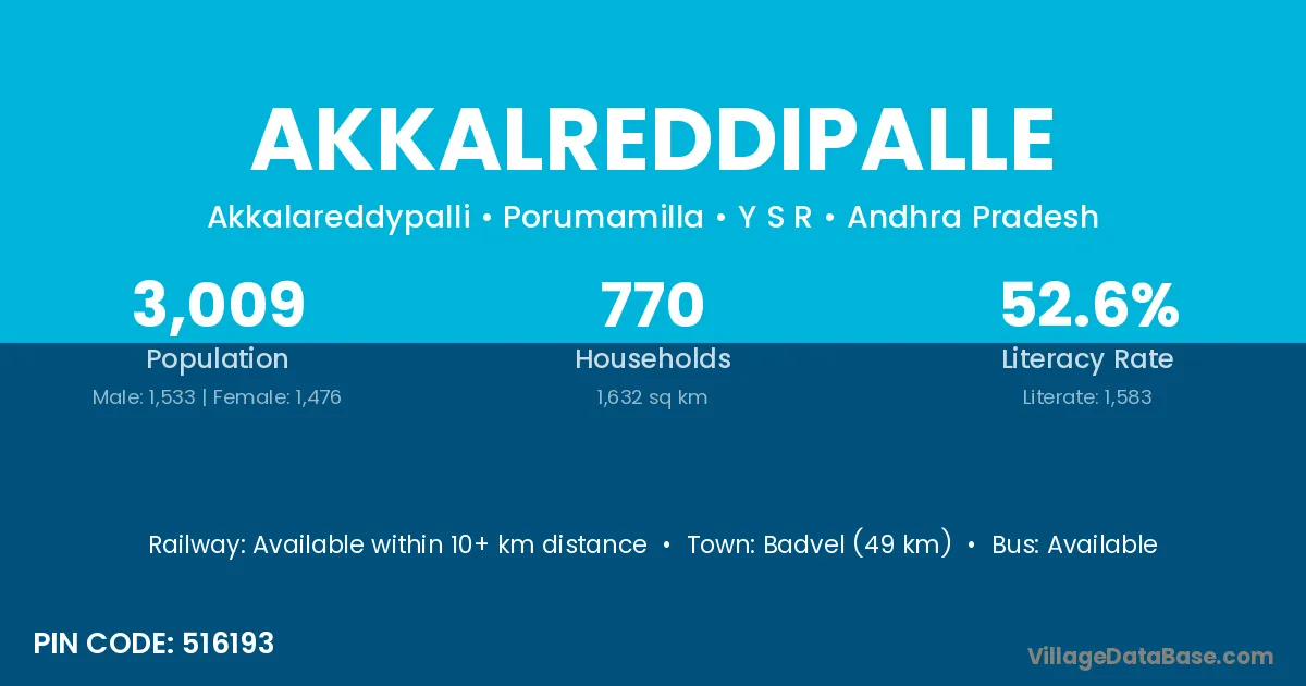 Badvel (49 km) is the nearest town to Akkalreddipalle village for major economic activities and is located approximately 49 km away.