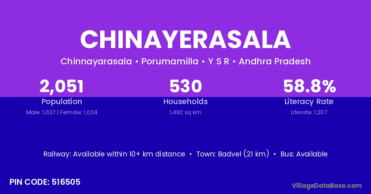 Badvel (21 km) is the nearest town to Chinayerasala village for major economic activities and is located approximately 21 km away.