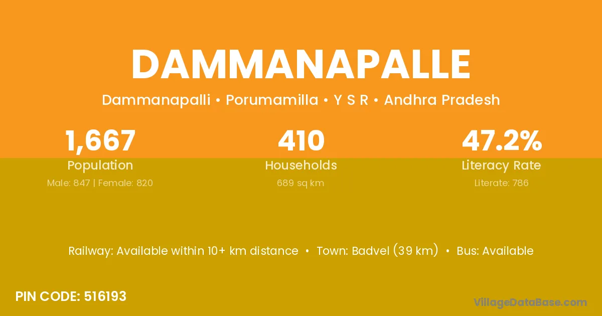 Badvel (39 km) is the nearest town to Dammanapalle village for major economic activities and is located approximately 39 km away.