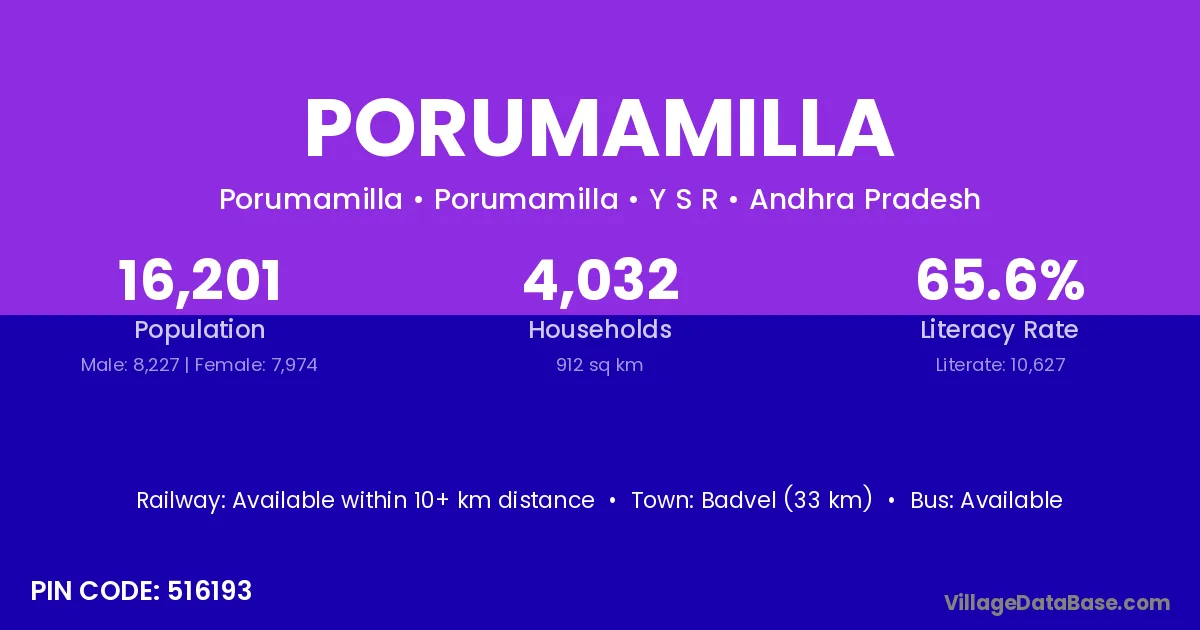 Badvel (33 km) is the nearest town to Porumamilla village for major economic activities and is located approximately 33 km away.