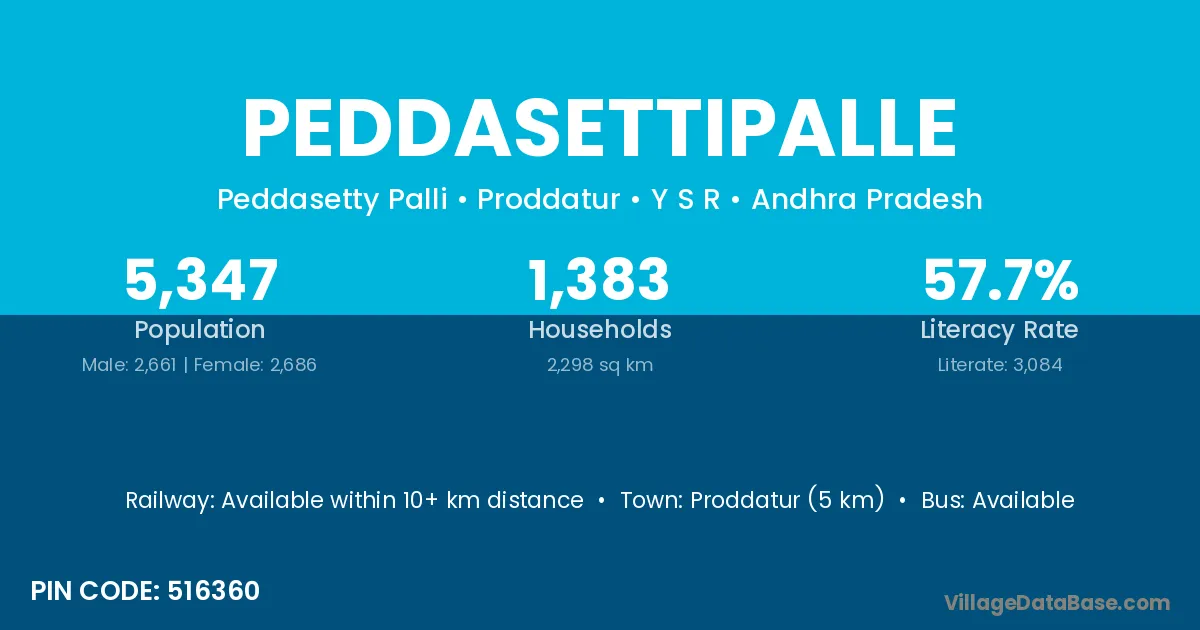 Proddatur (5 km) is the nearest town to Peddasettipalle village for major economic activities and is located approximately 5 km away.