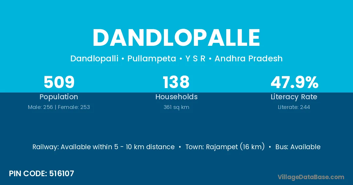 Rajampet (16 km) is the nearest town to Dandlopalle village for major economic activities and is located approximately 16 km away.