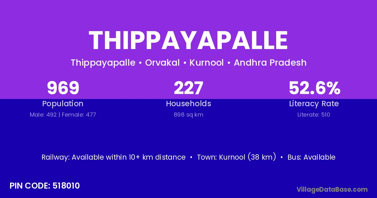 The literacy rate of Thippayapalle village is 55.77%. Male literacy stands at 65.43% and female literacy at 46.14%.