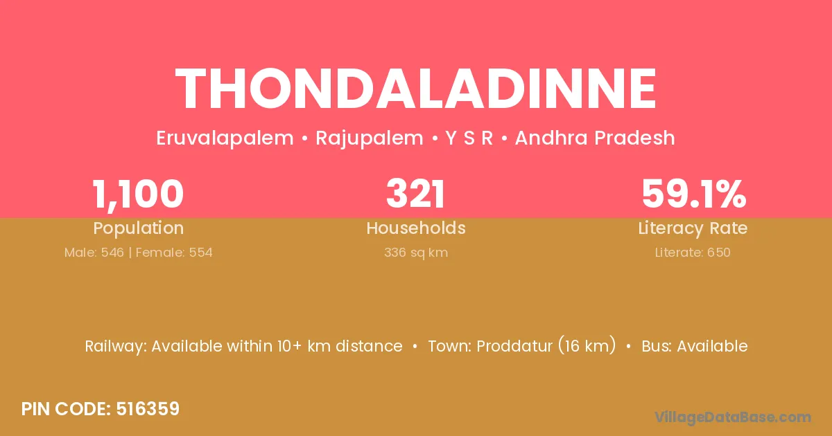 Proddatur (16 km) is the nearest town to Thondaladinne village for major economic activities and is located approximately 16 km away.
