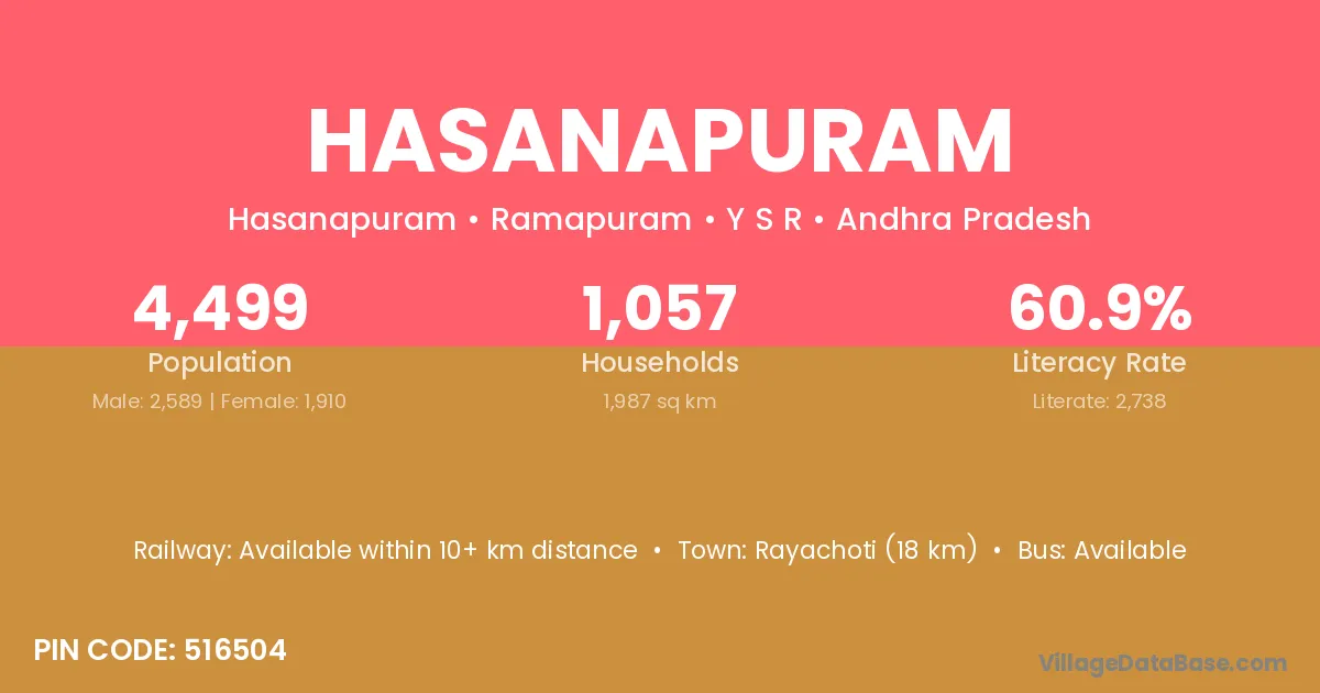 Rayachoti (18 km) is the nearest town to Hasanapuram village for major economic activities and is located approximately 18 km away.