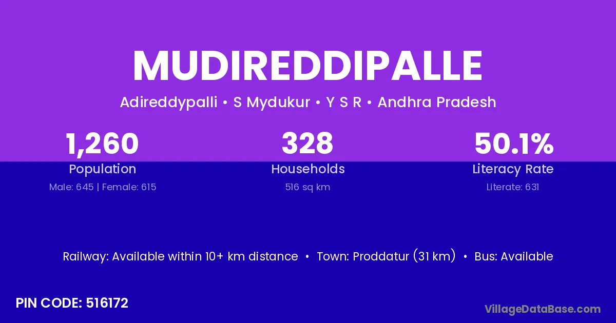 Mudireddipalle village has a total population of 1,260 people, of which 645 are males and 615 are females.