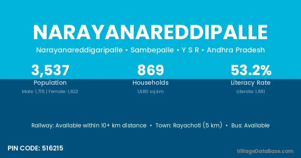 Rayachoti (5 km) is the nearest town to Narayanareddipalle village for major economic activities and is located approximately 5 km away.