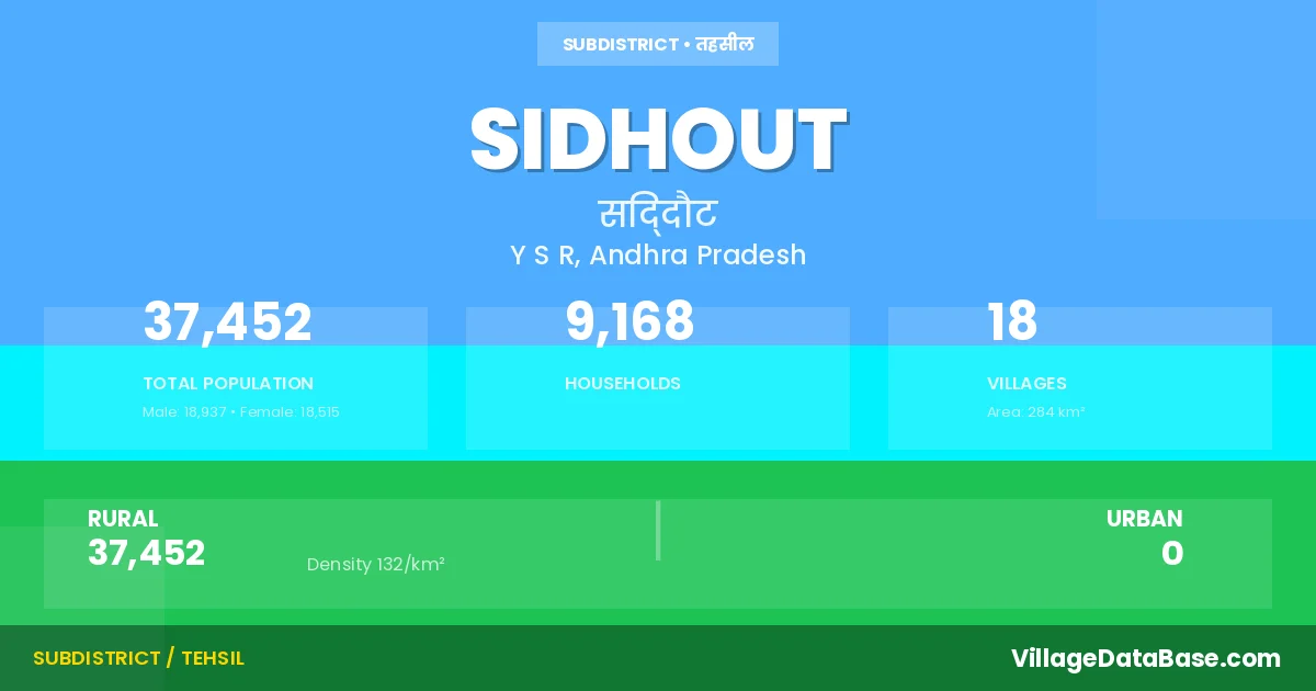 Sidhout is a town and Mandal in the Y S R district of the Andhra Pradesh. In India, a Mandal is a subdivision of a district responsible for the administration and revenue collection of a specific area within the district. Mandals play a crucial role in the local governance structure, contributing significantly to the development and administration of their communities.