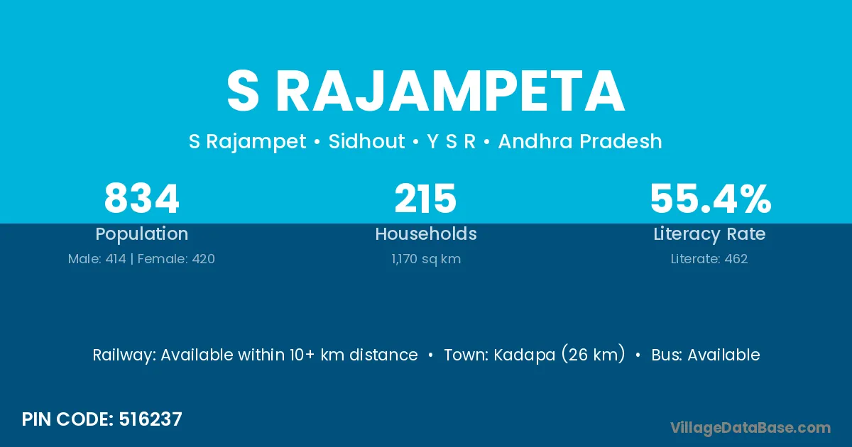 Kadapa (26 km) is the nearest town to S Rajampeta village for major economic activities and is located approximately 26 km away.