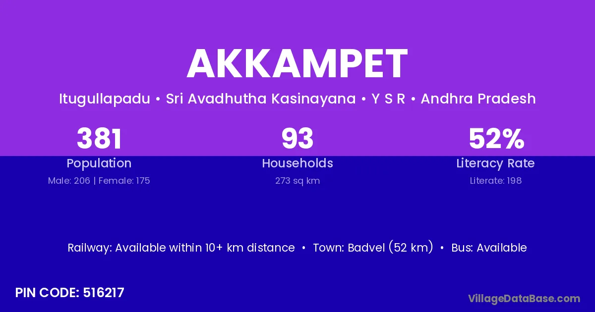 Badvel (52 km) is the nearest town to Akkampet village for major economic activities and is located approximately 52 km away.
