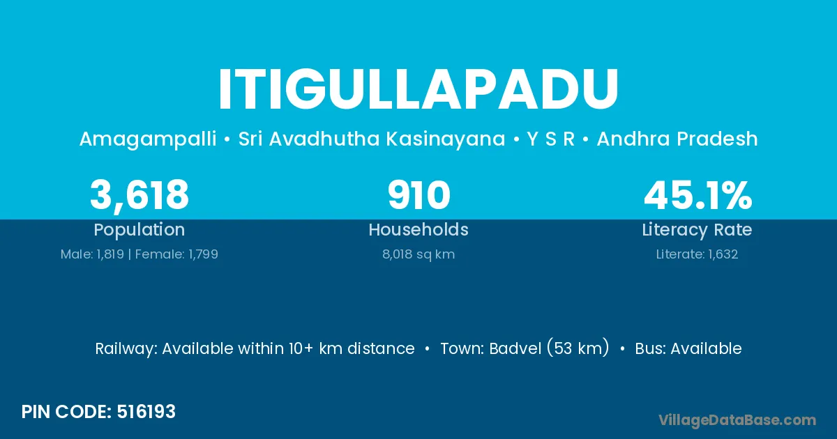 Badvel (53 km) is the nearest town to Itigullapadu village for major economic activities and is located approximately 53 km away.