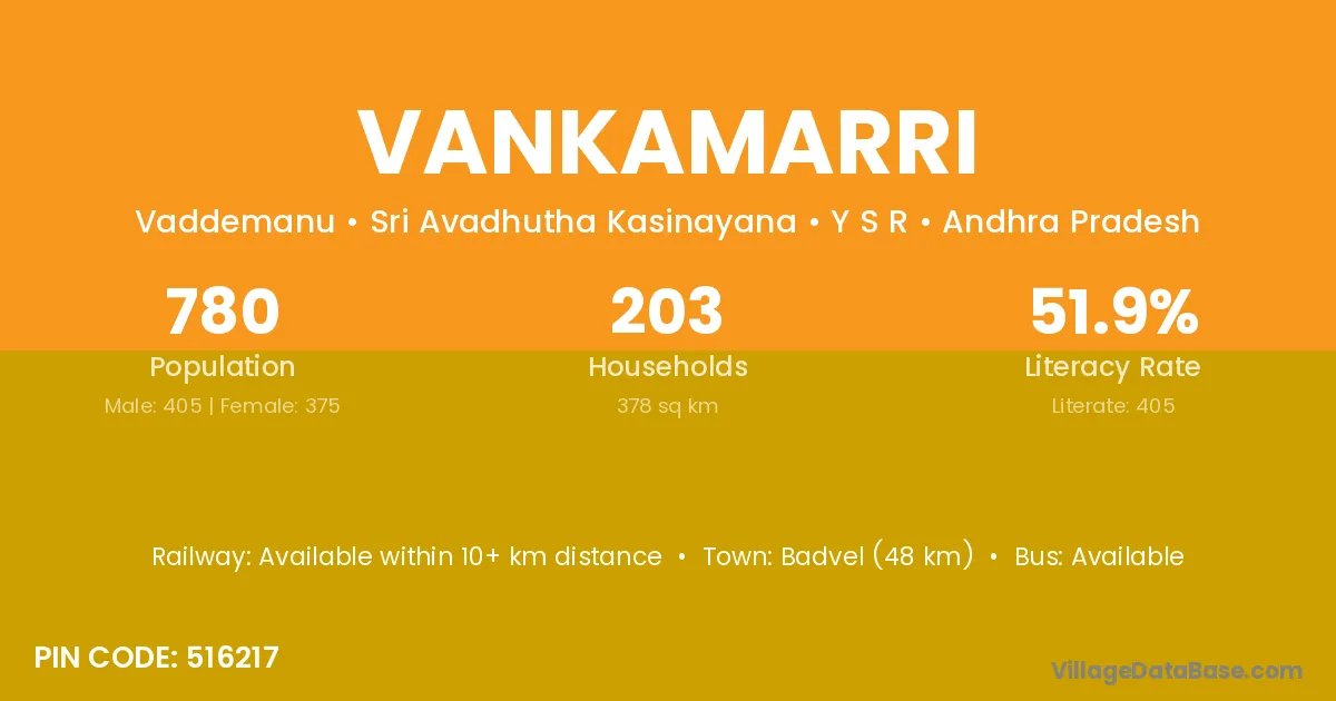 Badvel (48 km) is the nearest town to Vankamarri village for major economic activities and is located approximately 48 km away.