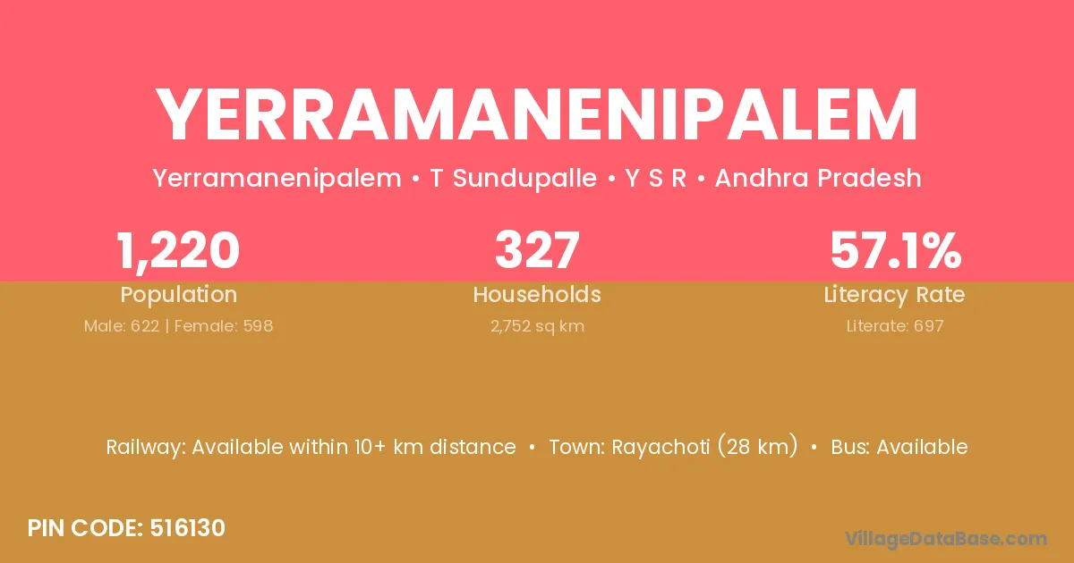 Yerramanenipalem village has a total population of 1,220 people, of which 622 are males and 598 are females.