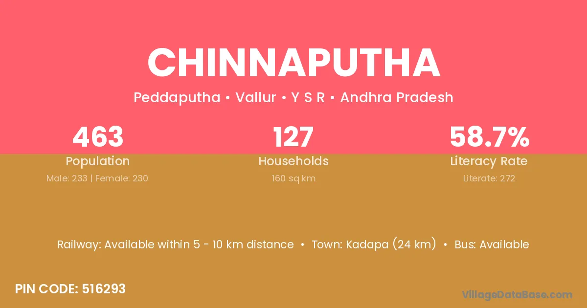 Kadapa (24 km) is the nearest town to Chinnaputha village for major economic activities and is located approximately 24 km away.