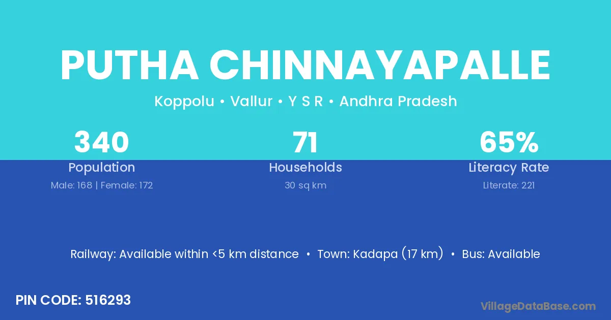 Kadapa (17 km) is the nearest town to Putha Chinnayapalle village for major economic activities and is located approximately 17 km away.