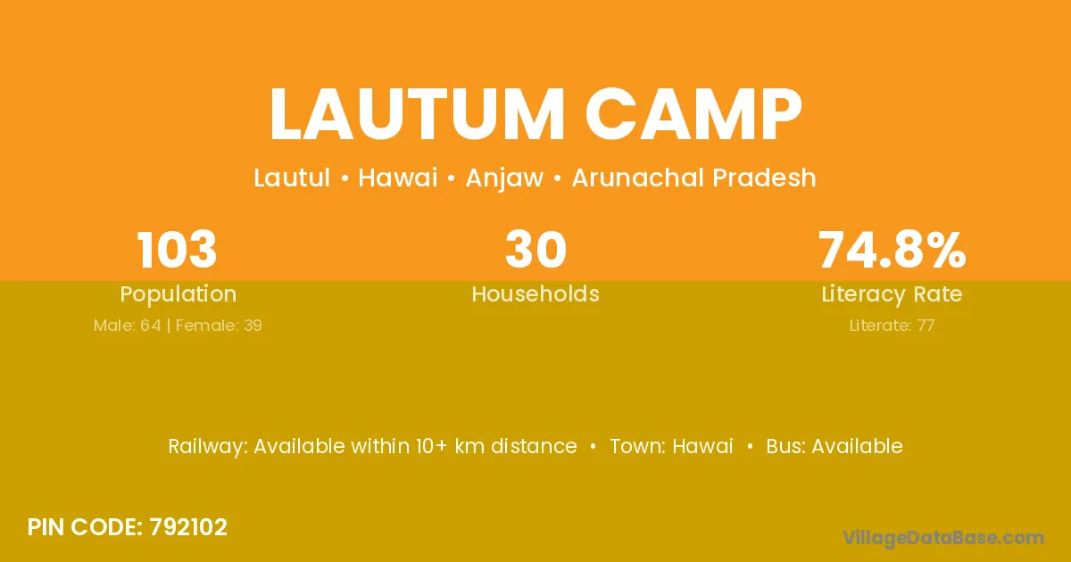 Lautum Camp village has a total population of 103 people, of which 64 are males and 39 are females.