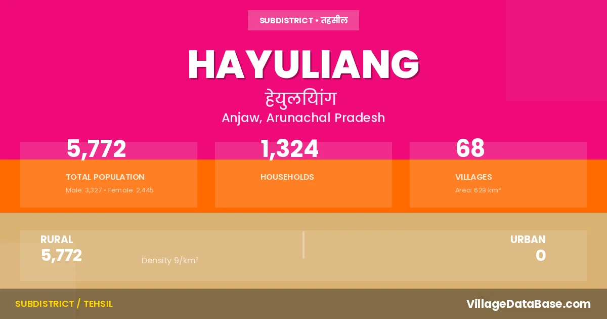 Hayuliang is a town and Circle in the Anjaw district of the Arunachal Pradesh. In India, a Circle is a subdivision of a district responsible for the administration and revenue collection of a specific area within the district. Circles play a crucial role in the local governance structure, contributing significantly to the development and administration of their communities.