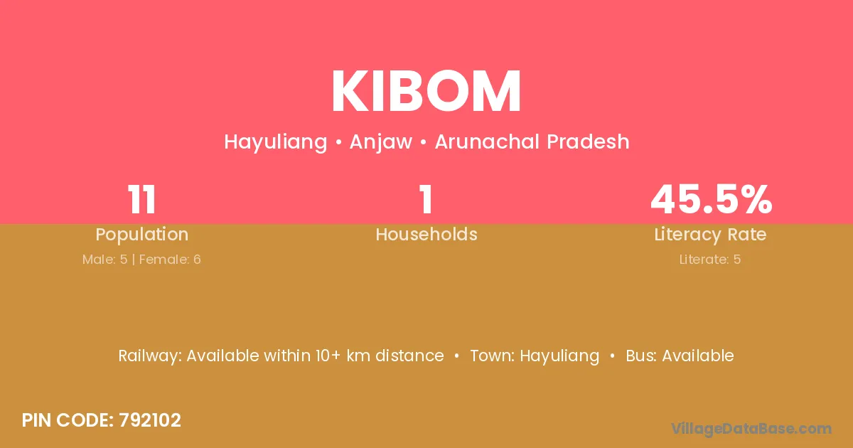 The literacy rate of Kibom village is 45.45%. Male literacy stands at 80.00% and female literacy at 16.67%.