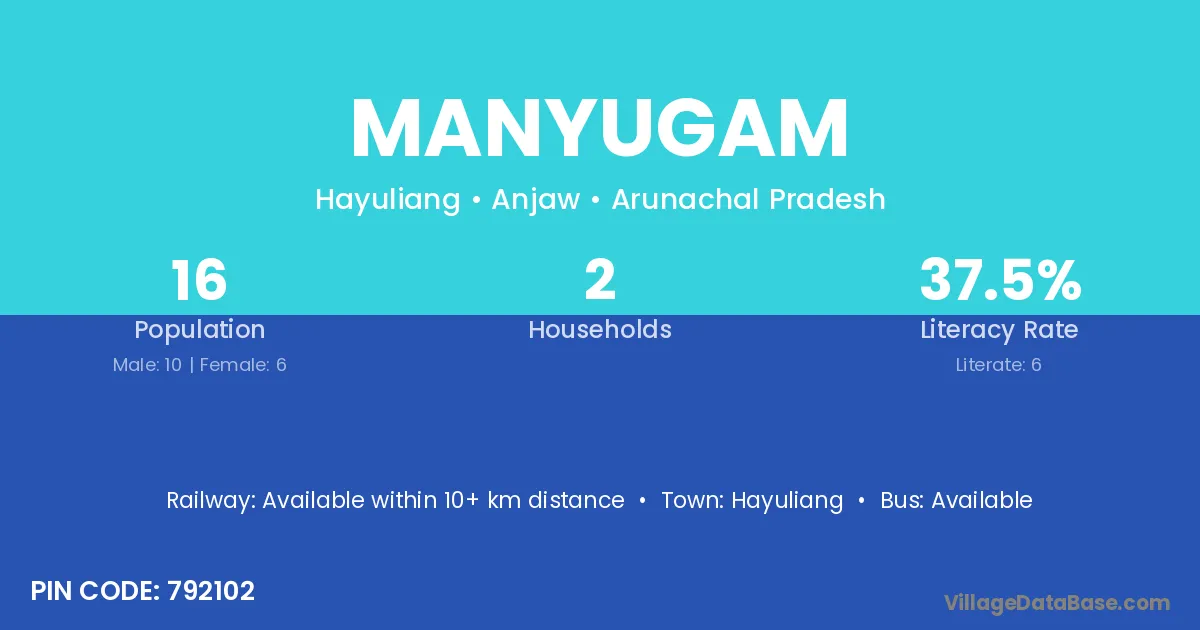 Manyugam village has a total population of 16 people, of which 10 are males and 6 are females.