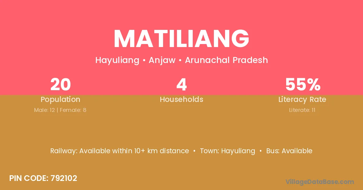 Matiliang village has a total population of 20 people, of which 12 are males and 8 are females.