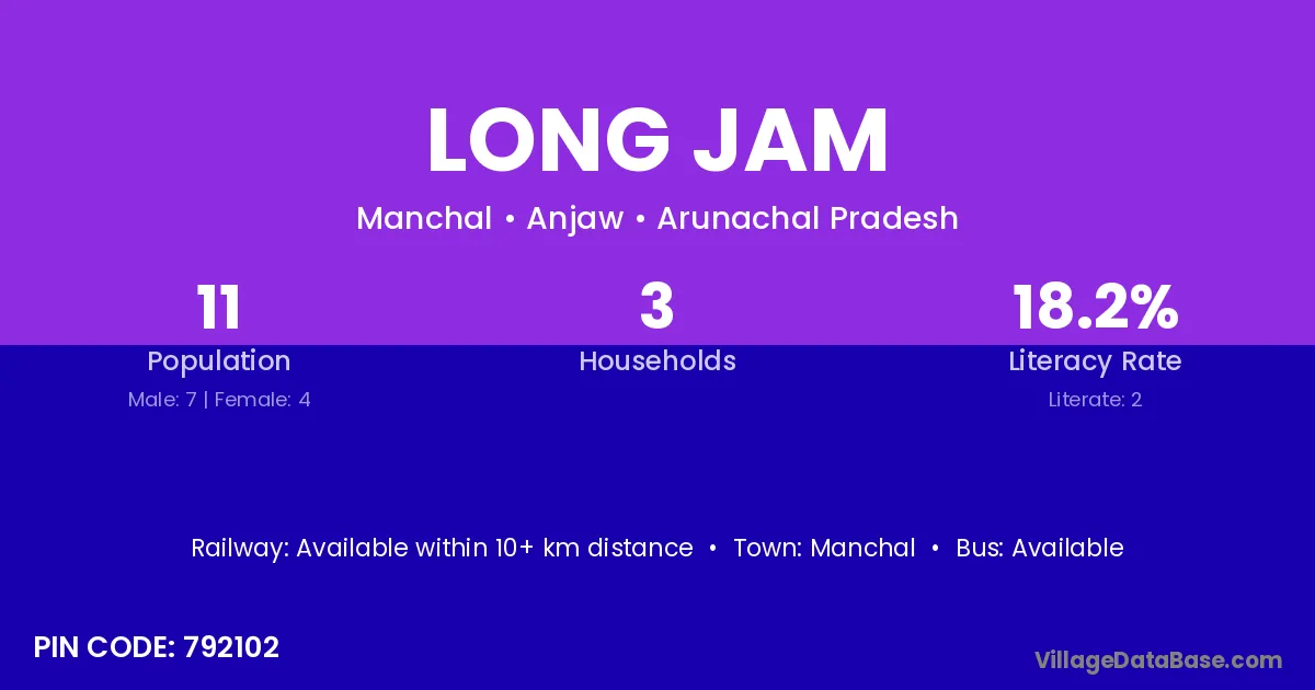 The literacy rate of Long Jam village is 18.18%. Male literacy stands at 28.57% and female literacy at 0.00%.