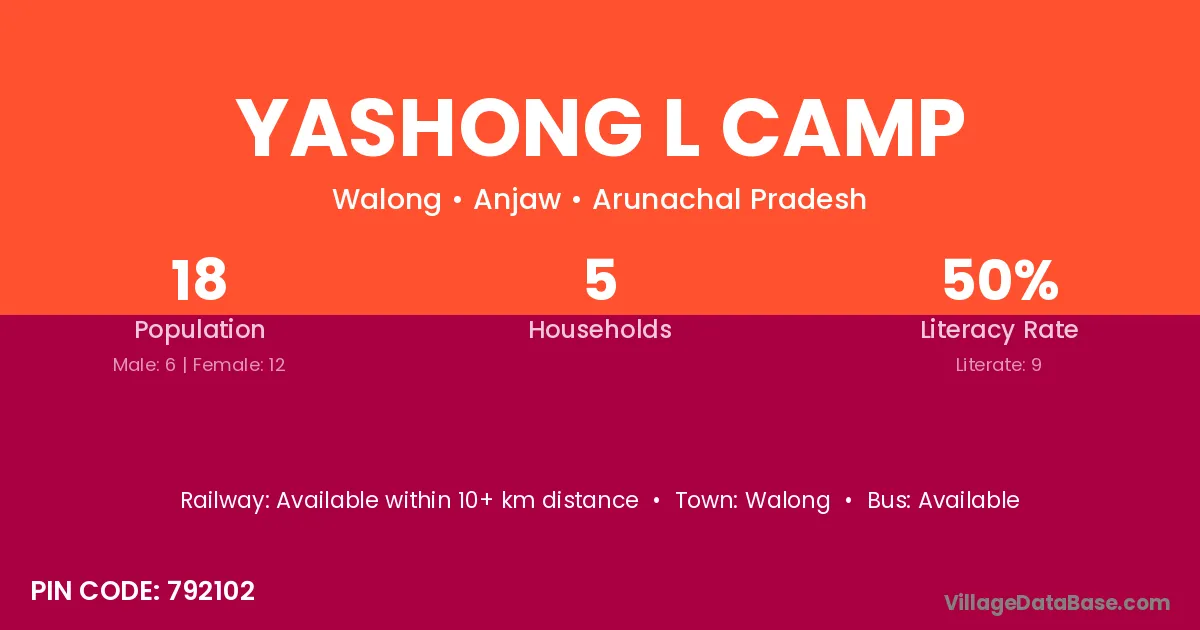 Yashong L Camp village has a total population of 18 people, of which 6 are males and 12 are females.