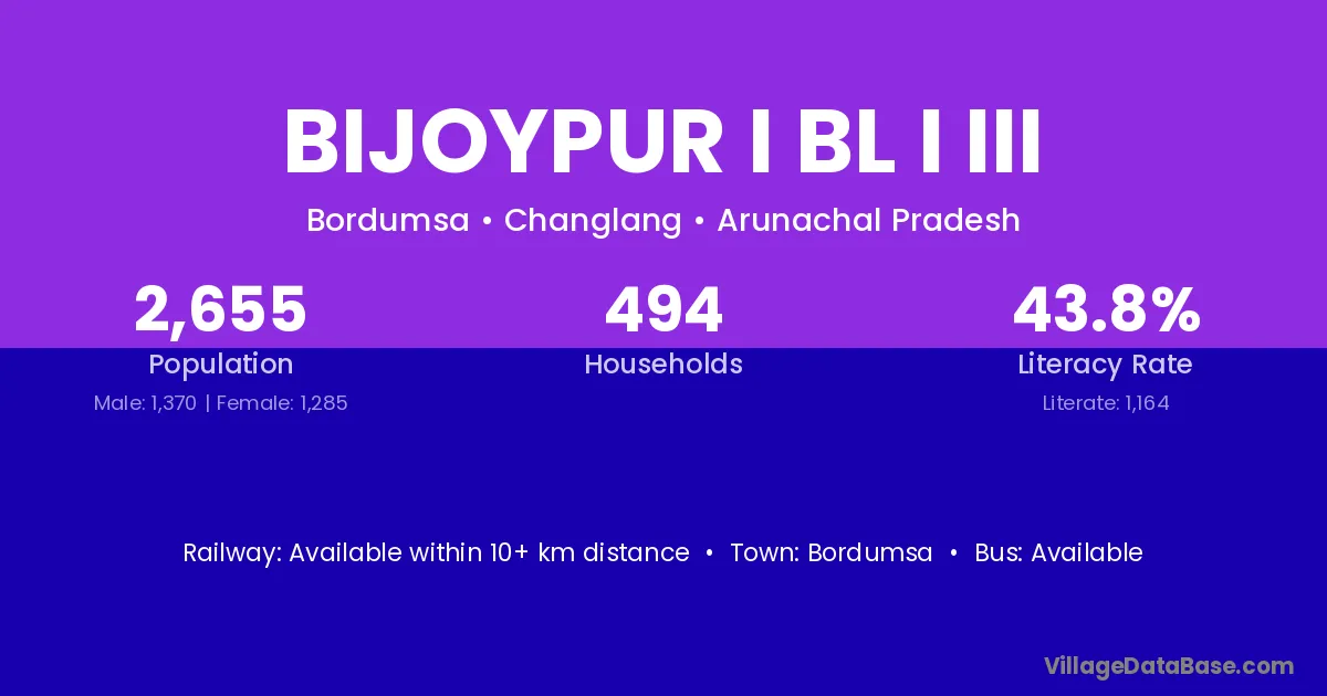 Bijoypur I Bl I Iii village has a total population of 2,655 people, of which 1,370 are males and 1,285 are females.