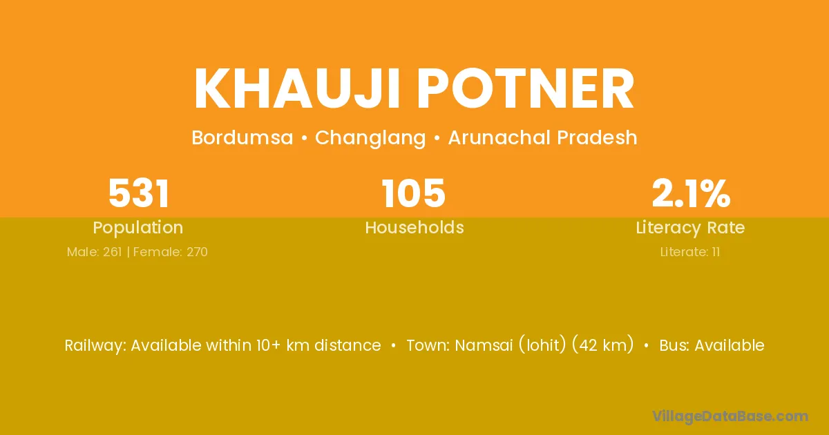 Namsai (lohit) (42 km) is the nearest town to Khauji Potner village for major economic activities and is located approximately 42 km away.