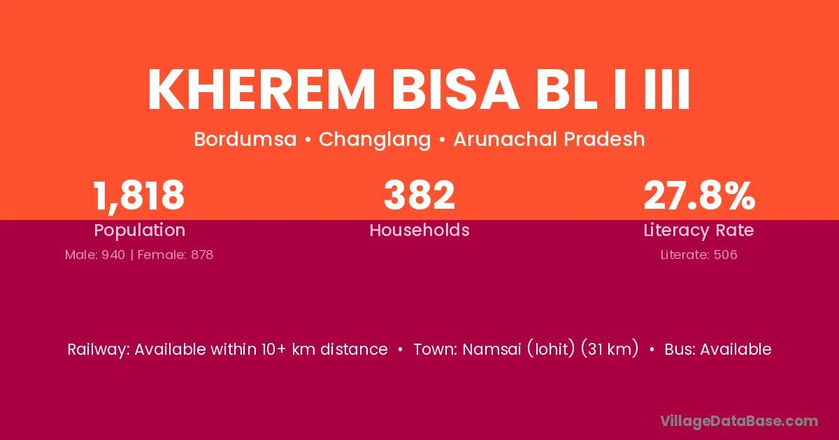 Namsai (lohit) (31 km) is the nearest town to Kherem Bisa Bl I Iii village for major economic activities and is located approximately 31 km away.
