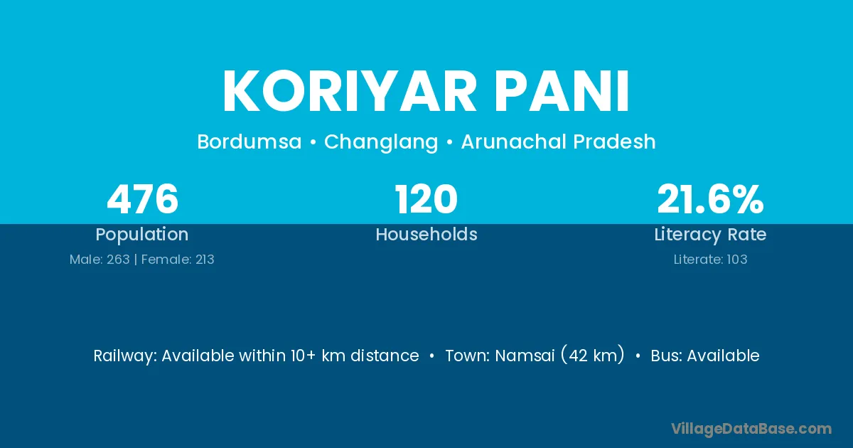 Namsai (42 km) is the nearest town to Koriyar Pani village for major economic activities and is located approximately 42 km away.