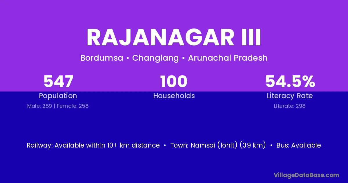 Rajanagar Iii village has a total population of 547 people, of which 289 are males and 258 are females.