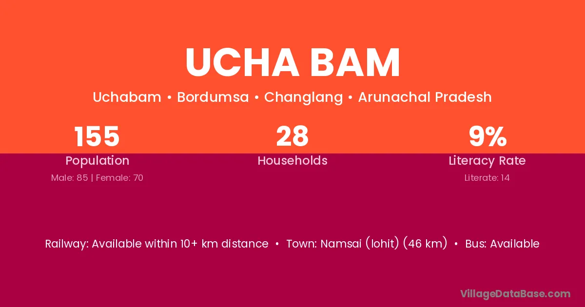 Namsai (lohit) (46 km) is the nearest town to Ucha Bam village for major economic activities and is located approximately 46 km away.