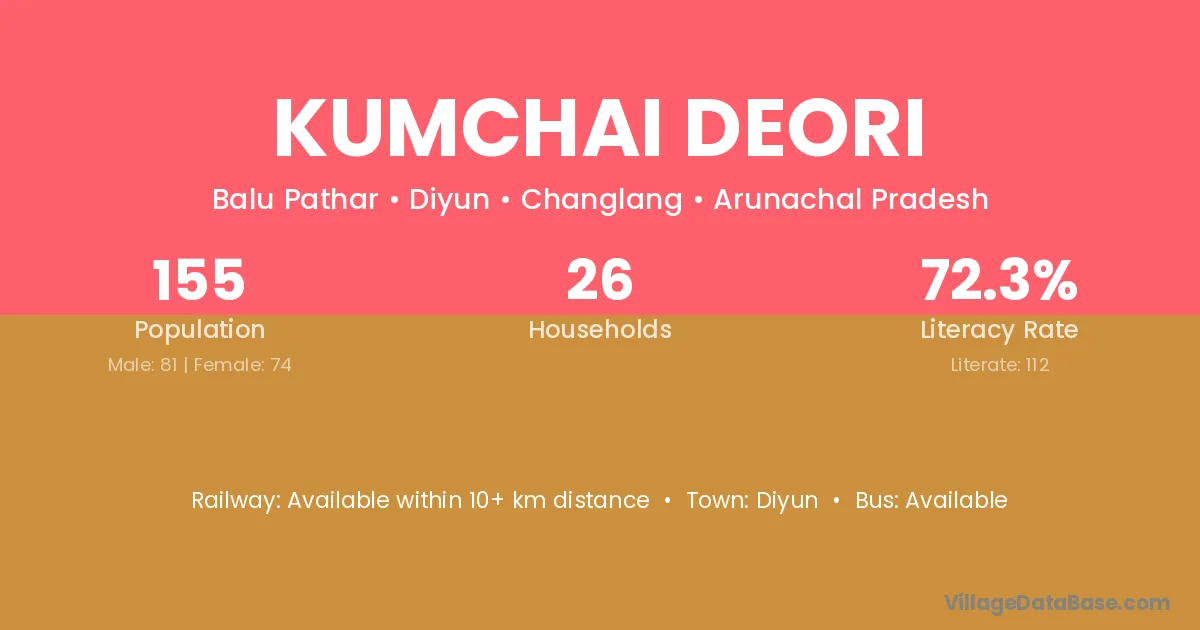 Kumchai Deori village has a total population of 155 people, of which 81 are males and 74 are females.