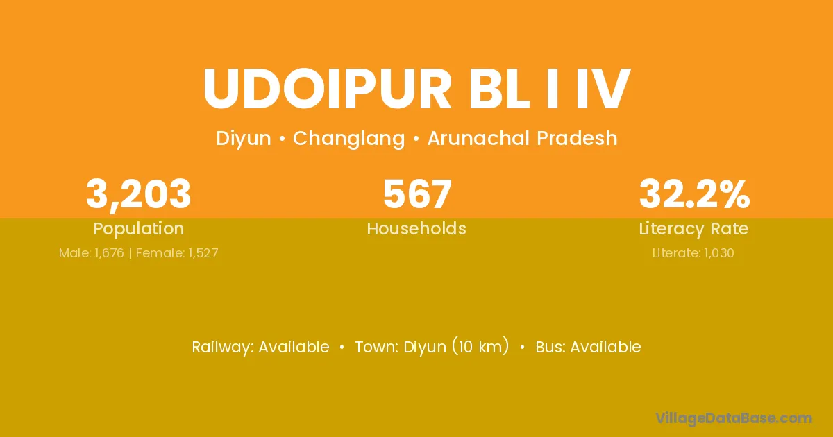 Diyun (10 km) is the nearest town to Udoipur Bl I Iv village for major economic activities and is located approximately 10 km away.