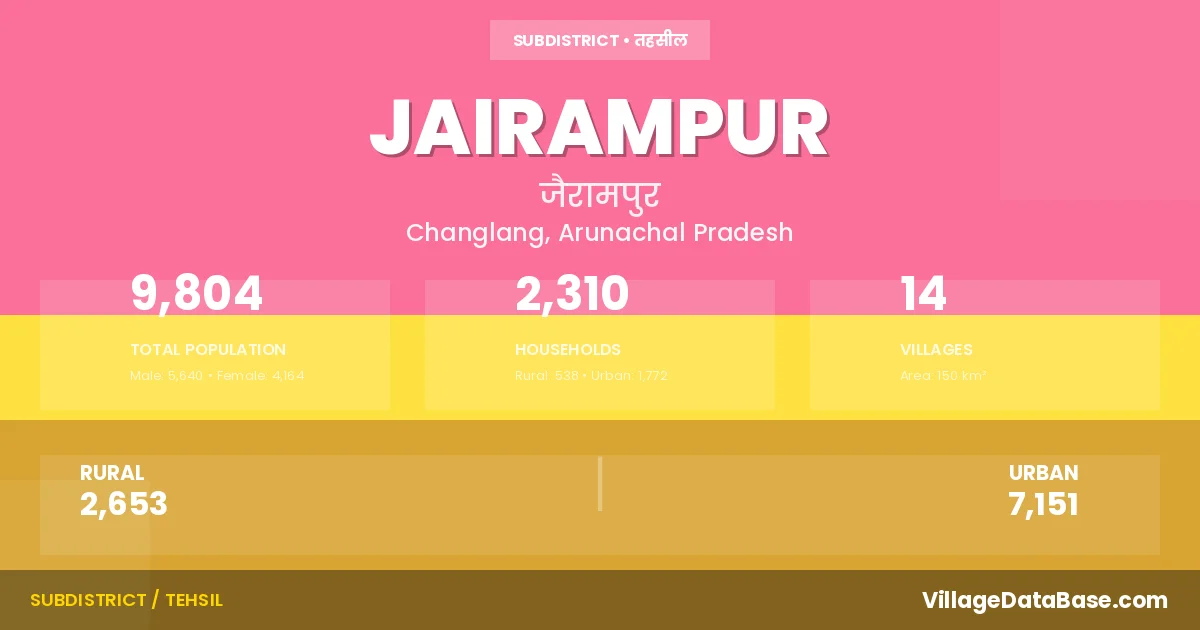 According to the 2011 census The total area of Jairampur Circle is 150 km², with a population of 9804 people. The population density is 65 inhabitants per square kilometre, and there are approximately 2310 houses in the sub district.