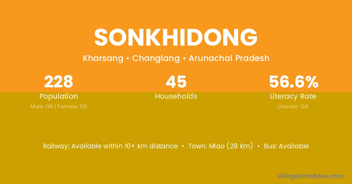 Miao (28 km) is the nearest town to Sonkhidong village for major economic activities and is located approximately 28 km away.