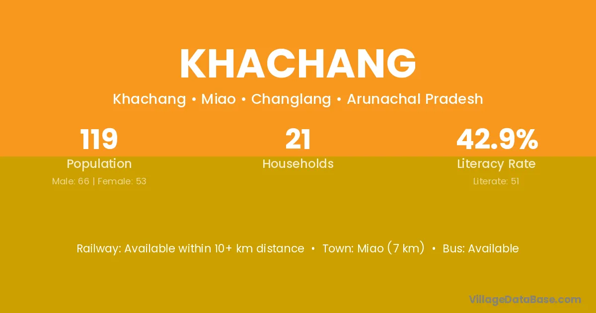 Miao (7 km) is the nearest town to Khachang village for major economic activities and is located approximately 7 km away.