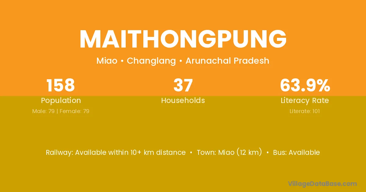 Miao (12 km) is the nearest town to Maithongpung village for major economic activities and is located approximately 12 km away.