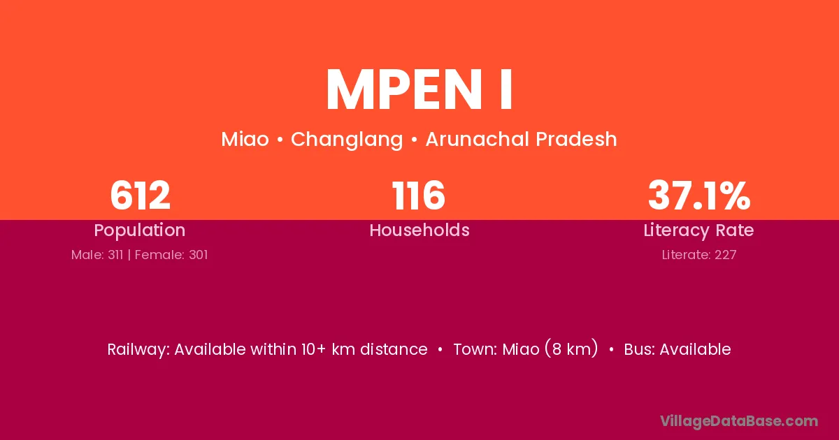 The literacy rate of Mpen I village is 37.09%. Male literacy stands at 49.52% and female literacy at 24.25%.