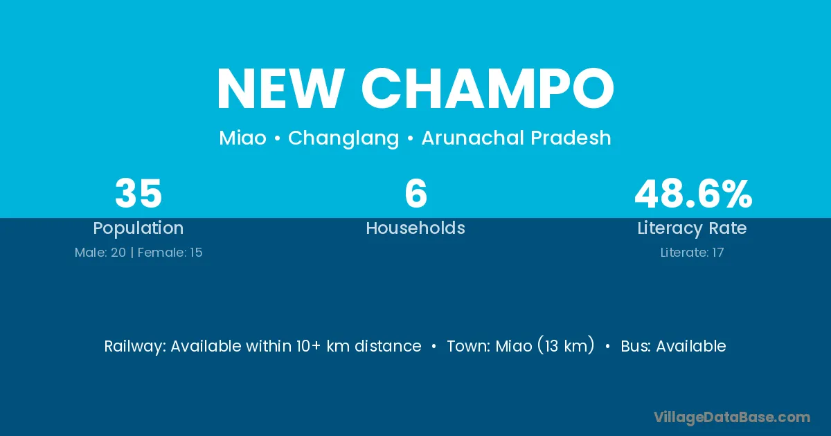 Miao (13 km) is the nearest town to New Champo village for major economic activities and is located approximately 13 km away.
